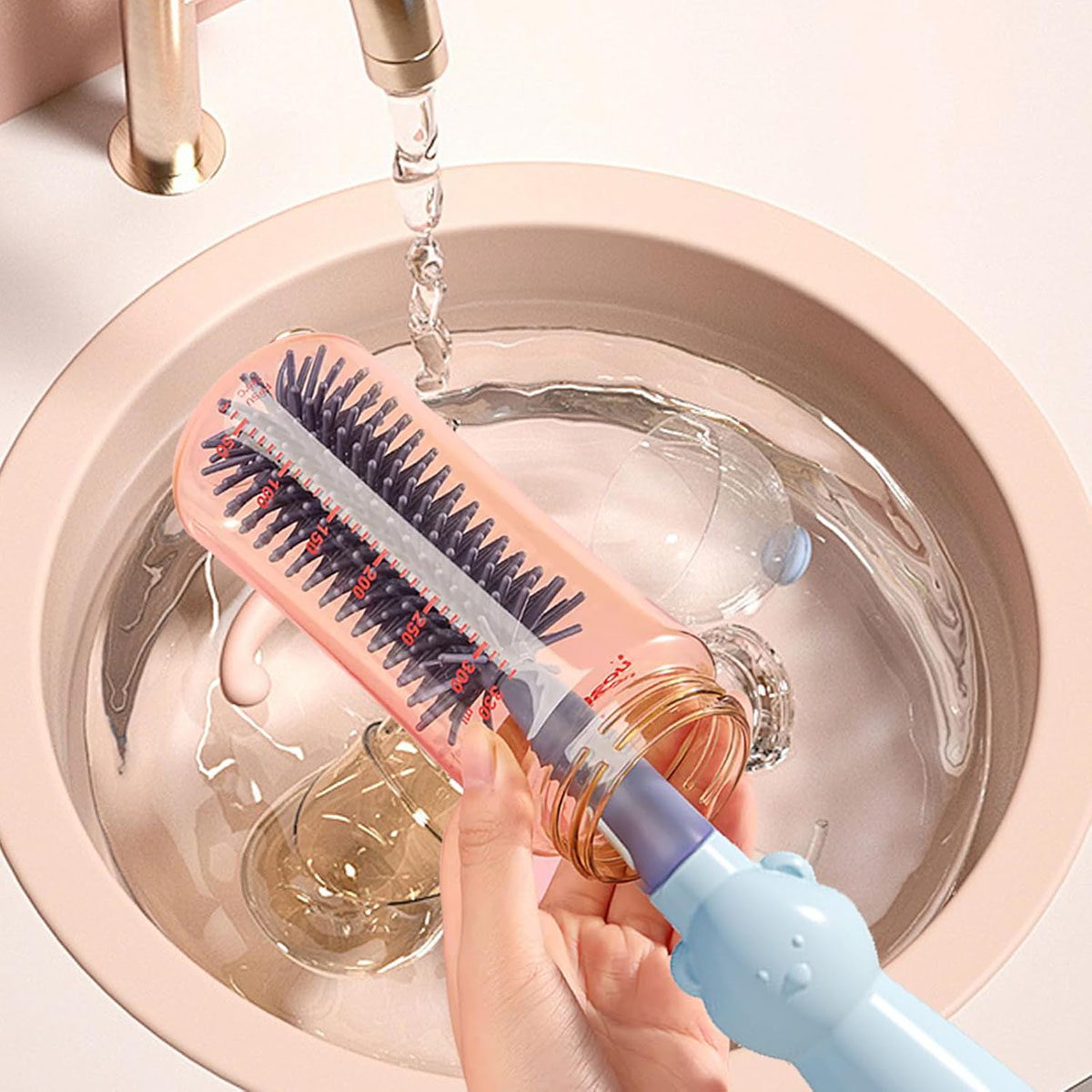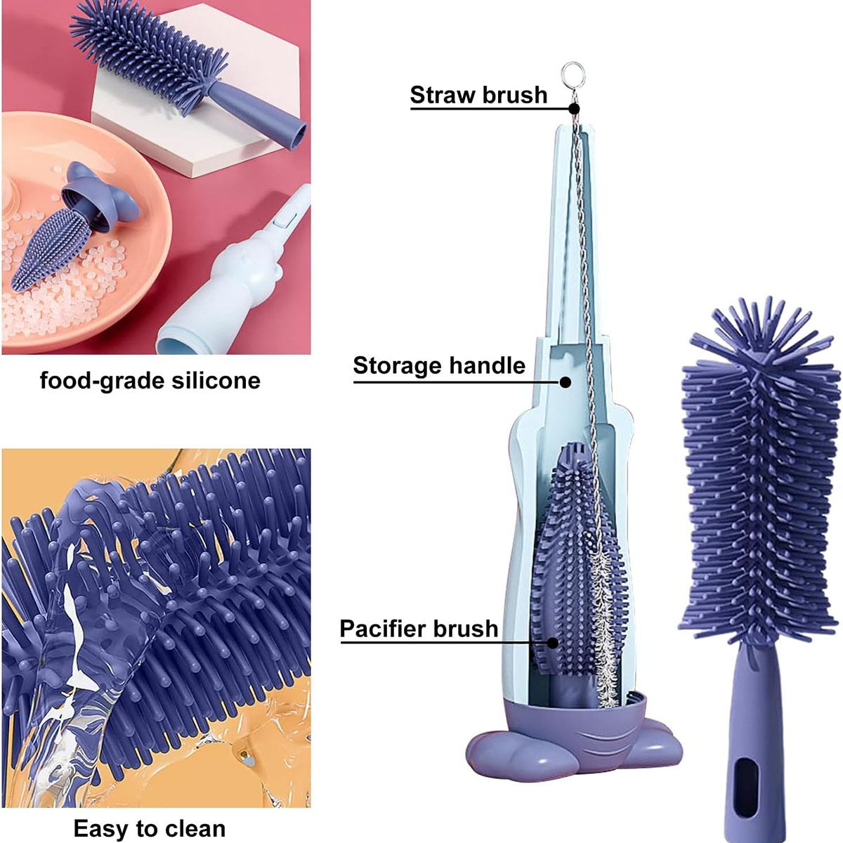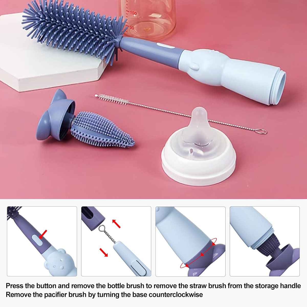 • Cleaning at multiple angles: the top of the bottle cleaning brush is covered with silicone to prevent bottles from being scratched. The dummy brush adapts to the shape of the dummy and can be rotated 360° for cleaning without dead ends.